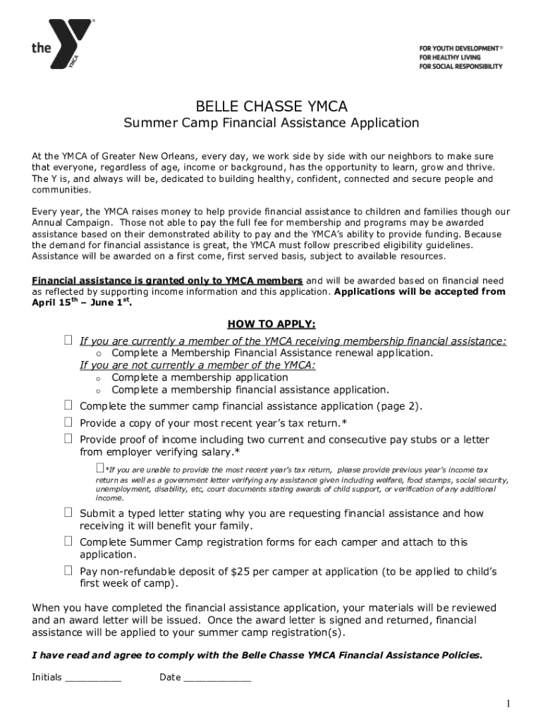 BELLE CHASSE YMCASummer Camp Financial Assistance Application At the YMCA of Greater New Orleans, every day, we work side by side with our neighbors to make sure that everyone, regardless of age,