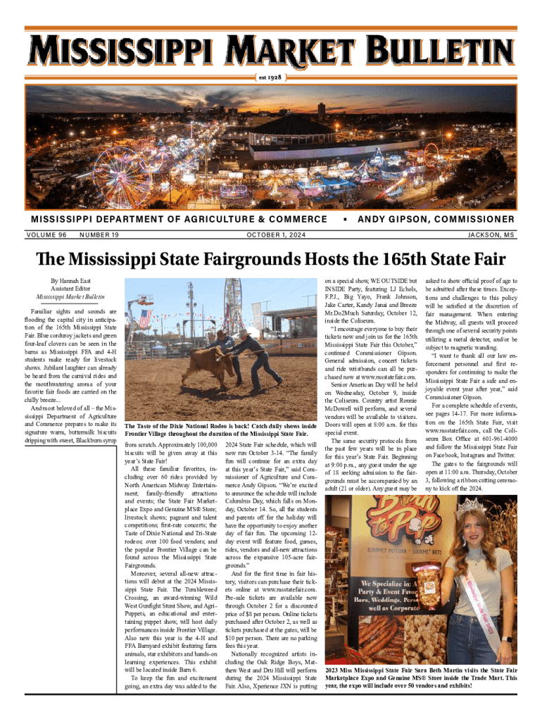 MIS SIS SIPPI DEPAR T MEN T OF AGR ICULT UR E & COMMERCE VO LU M E 9 6N U M B E R 19 ANDY GIPSON, COMMIS SIONERO C TO B E R 1 , 2024JAC K S O N , MSThe Mississippi State Fairgrounds Hosts the 165th