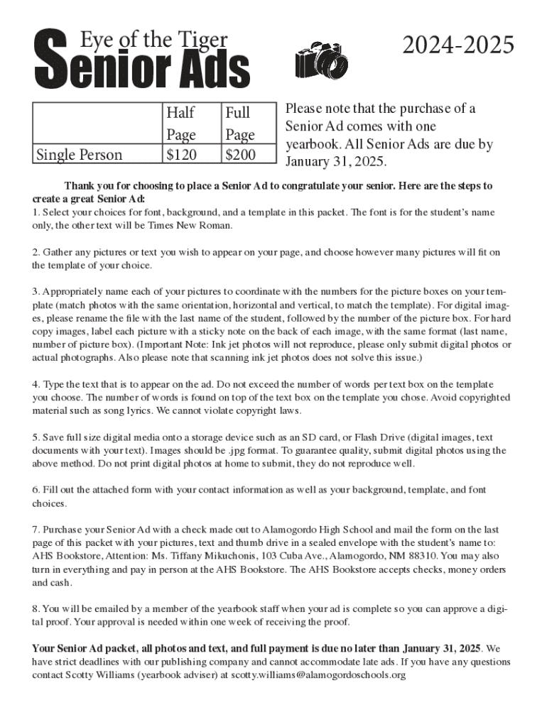 Senior Ads Eye of the TigerSingle PersonHalf Page $120Full Page $20020242025 Please note that the purchase of a Senior Ad comes with one yearbook. All Senior Ads are due by January 31, 2025.Thank