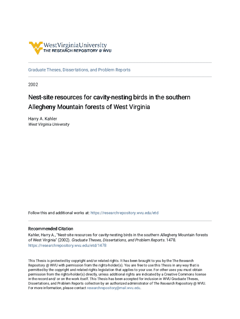 This thesis examines the availability and characteristics of nest-site resources essential for cavity-nesting birds in the southern Allegheny Mountain forests of West Virginia. It presents an analysis of the relationship between these resources and various bird species, focusing on management implications for forest conservation and biodiversity.