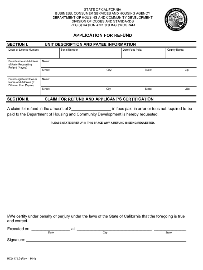 This document is used to request a refund for fees paid in error or fees that were not required to be paid to the Department of Housing and Community Development in California. It includes sections for the applicant to provide their information, the details of the payment, and the reason for requesting the refund.