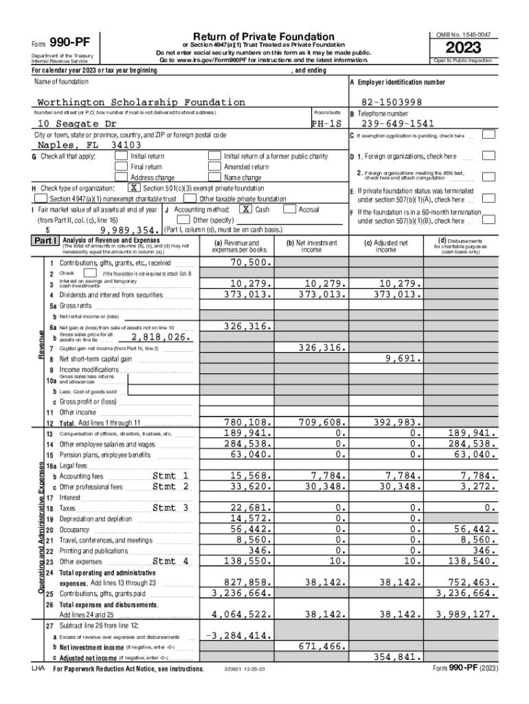 This document serves as the annual return for the Worthington Scholarship Foundation, outlining its financial activities, contributions, grants, and compliance with IRS regulations specific to private foundations for the tax year 2023.