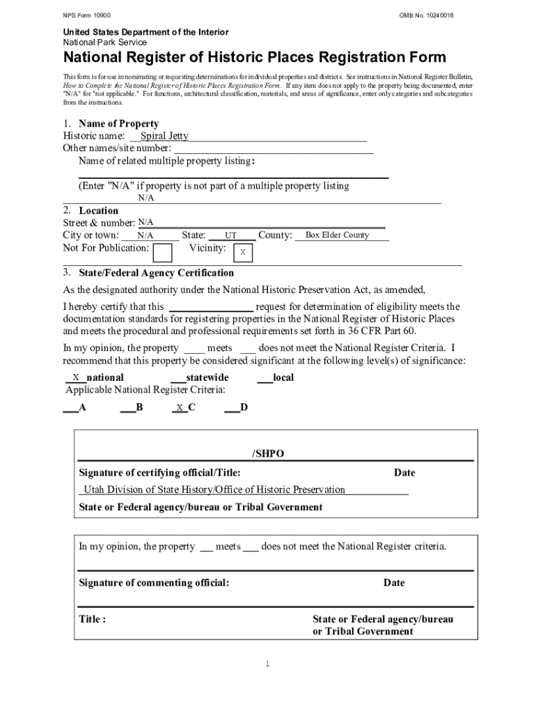 The National Register of Historic Places Registration Form for Spiral Jetty, created by artist Robert Smithson in 1970. This earthwork, located at Rozel Point on the Great Salt Lake in Box Elder County, Utah, is recognized for its significance in the fields of Land art and landscape architecture, demonstrating interactions between art, nature, and human influence. The document details the property’s description, significance, location, and various aspects of its historical context.