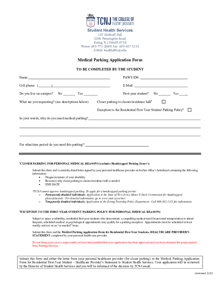 Student Health Services107 Eickhoff Hall 2000 Pennington Road Ewing, N.J. 086280718 Phone: 6097712889; Fax: 6096375131 EMail: health@tcnj.eduMedical Parking Application Form TO BE COMPLETED BY THE