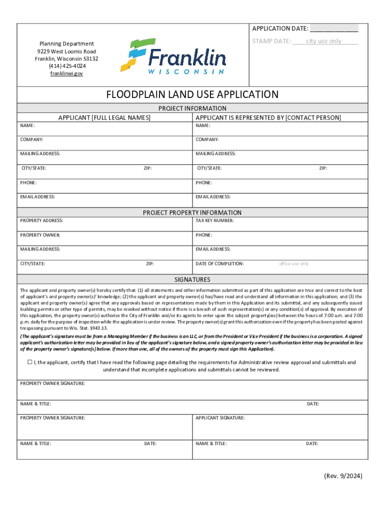 This document serves as an application form for individuals or entities seeking approval for land use in floodplain areas within the City of Franklin, Wisconsin. It includes requirements for submission, applicant and property owner certifications, and necessary materials to obtain a floodplain land use permit.
