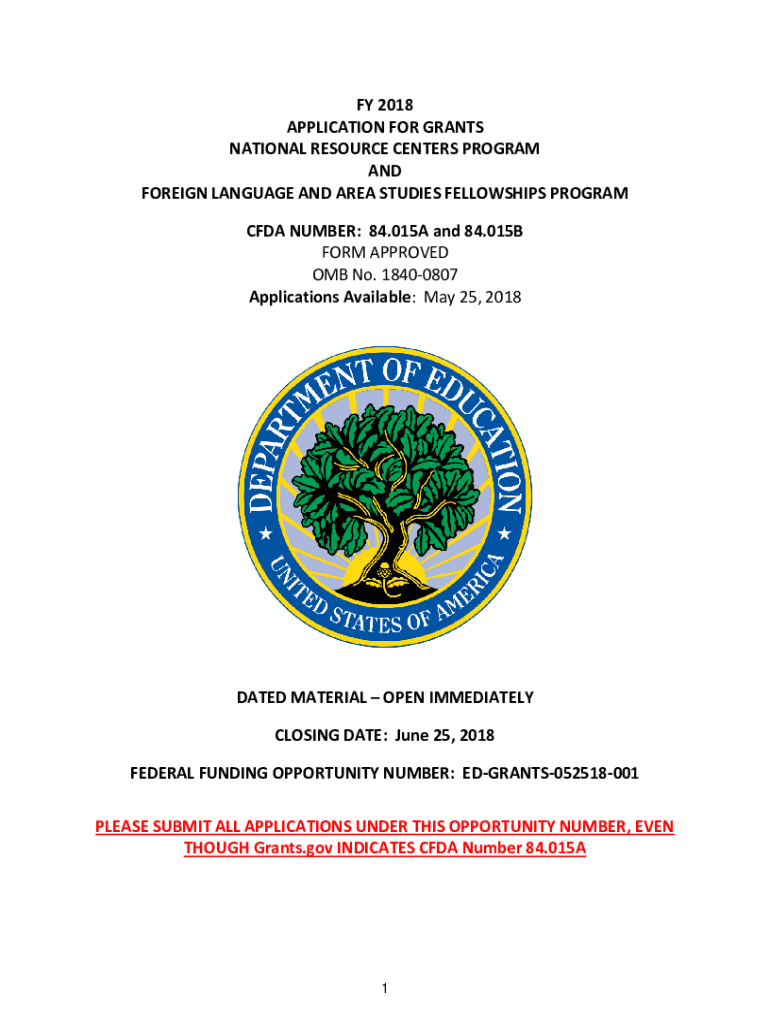 FY 2018 APPLICATION FOR GRANTS NATIONAL RESOURCE CENTERS PROGRAM AND FOREIGN LANGUAGE AND AREA STUDIES FELLOWSHIPS PROGRAM CFDA NUMBER: 84.015A and 84.015B FORM APPROVED OMB No. 18400807 Applications