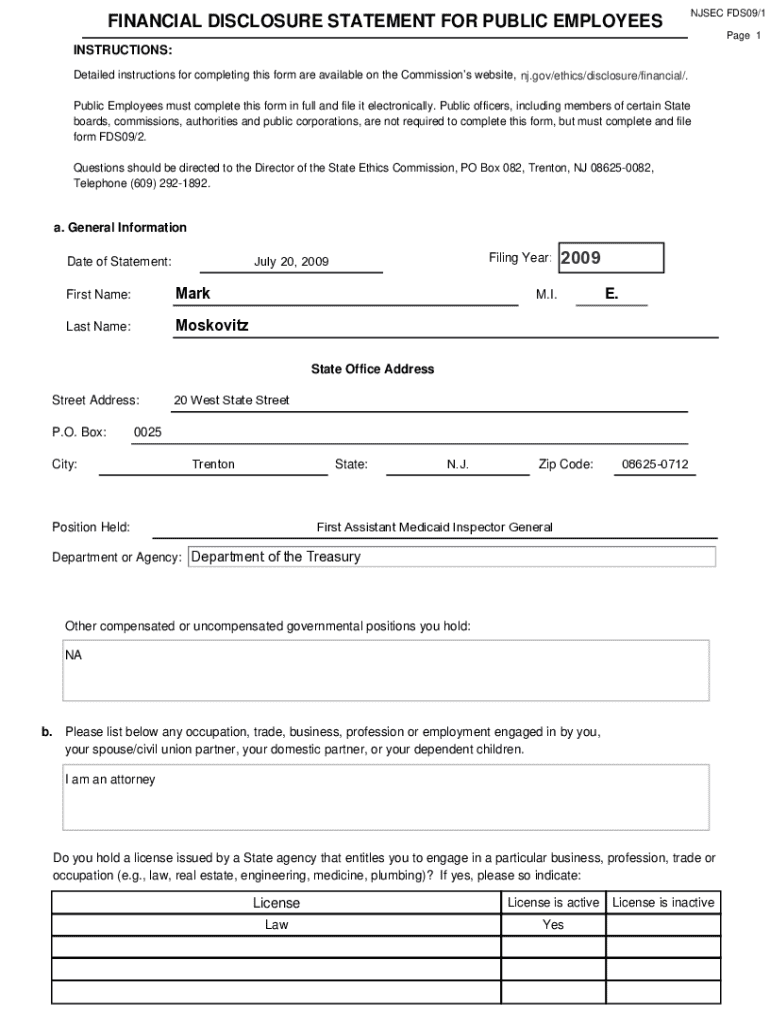 This document is a financial disclosure statement that public employees in New Jersey must complete and file electronically. It includes detailed instructions for reporting various financial interests, including employment, assets, income, and liabilities, to ensure compliance with state ethics regulations.