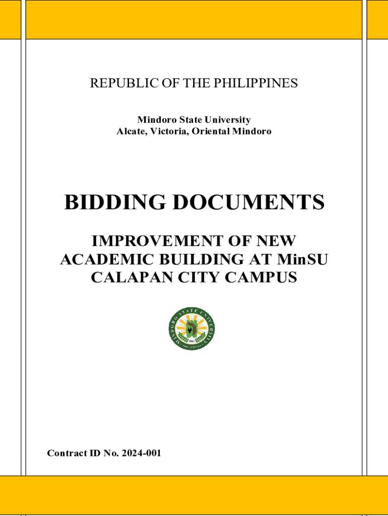 This document outlines the bidding process for the improvement of the new academic building at Mindoro State University, Calapan City Campus. It includes details on budget, bid security, work completion timelines, eligibility criteria for bidders, and required documentation.