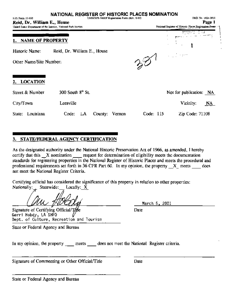 NATIONAL REGISTER OF HISTORIC PLACES NOMINATION NFS Form 10900USDI/NPS NRHP Registration Form (Rev. 886)OMB No. 10240018Reid, Dr. William ., HousePage 1United States Department of the Interior, National