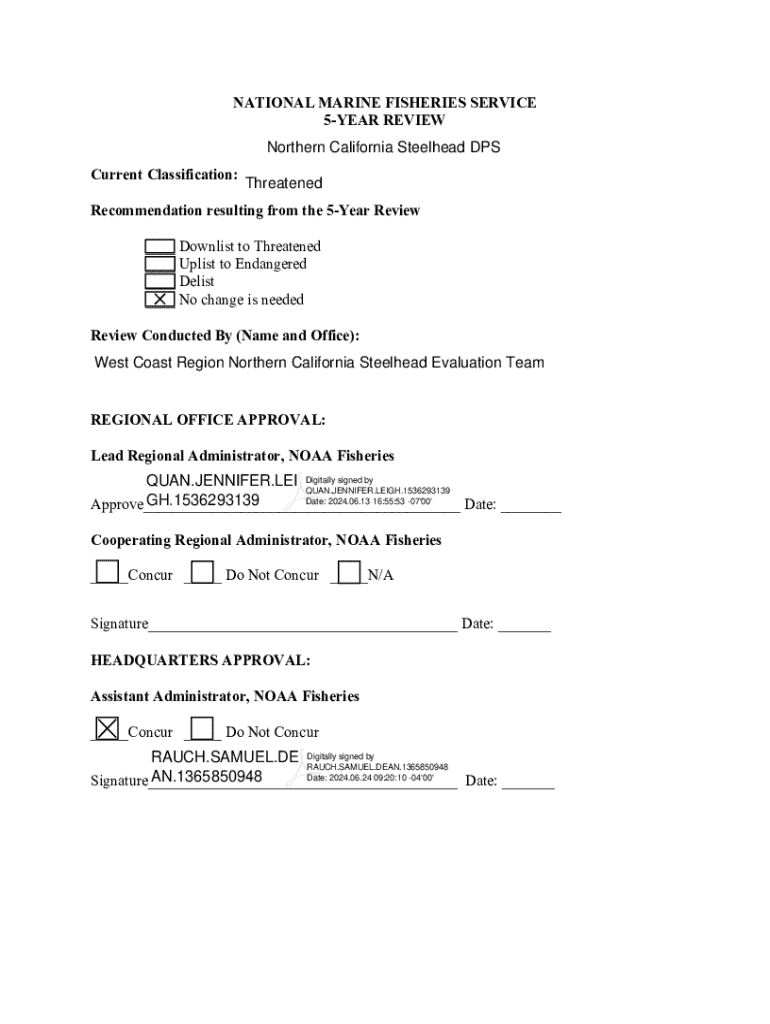 This document outlines the 2024 5-Year Review of the Northern California Steelhead distinct population segment (DPS), assessing its status, threats, recovery criteria, and recommendations for future actions to improve viability. The review evaluates the impacts of habitat destruction, overutilization, disease and predation, the inadequacy of existing regulatory mechanisms, and other factors affecting the species\' continued existence.