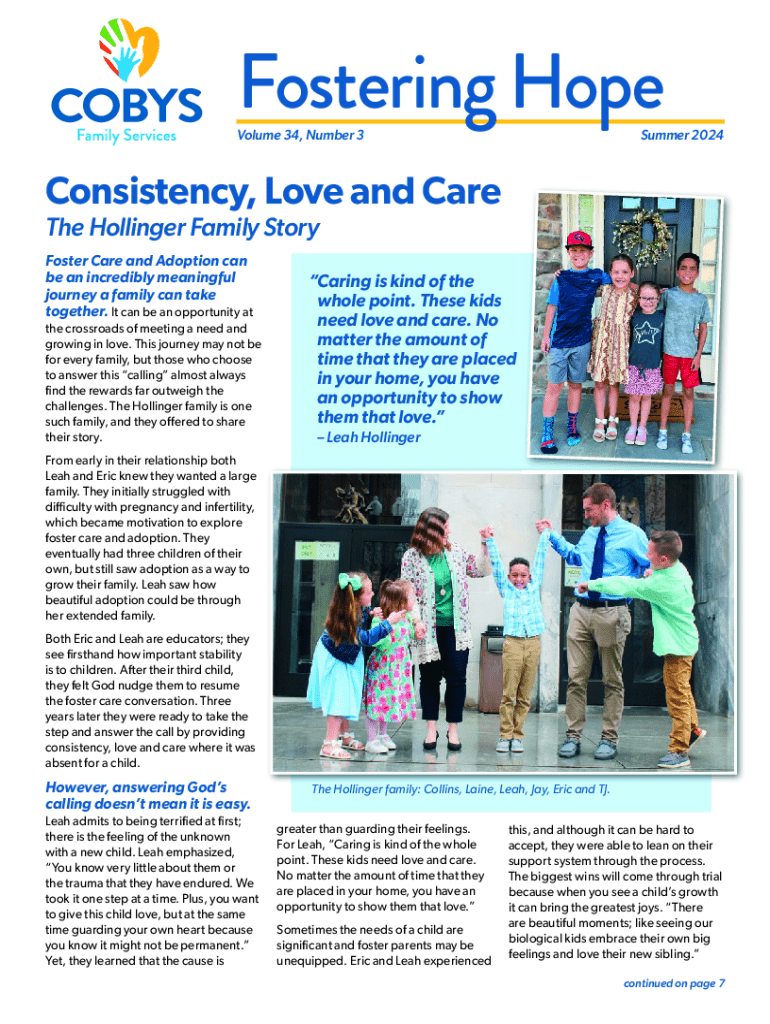 This document shares the story of the Hollinger family and their meaningful journey through foster care and adoption. It highlights the challenges and rewards of providing love and care for children in need, emphasizing the importance of building relationships and the support of COBYS Family Services.
