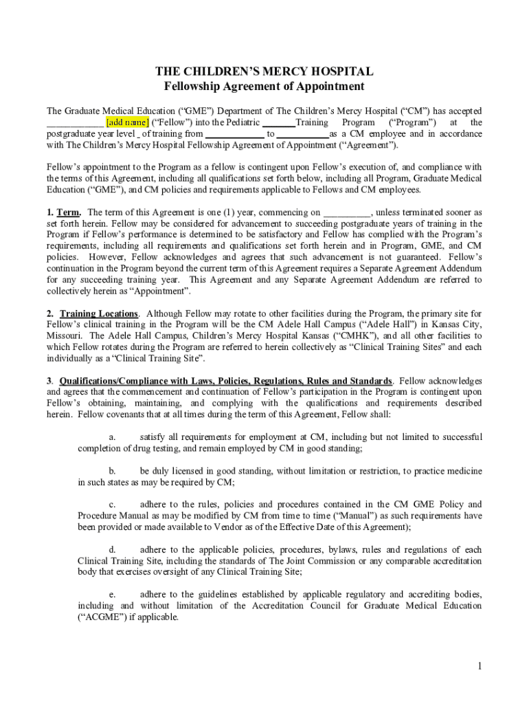 THE CHILDRENS MERCY HOSPITAL Fellowship Agreement of Appointment The Graduate Medical Education (GME) Department of The Childrens Mercy Hospital (CM) has accepted ___ [add name] (Fellow) into the