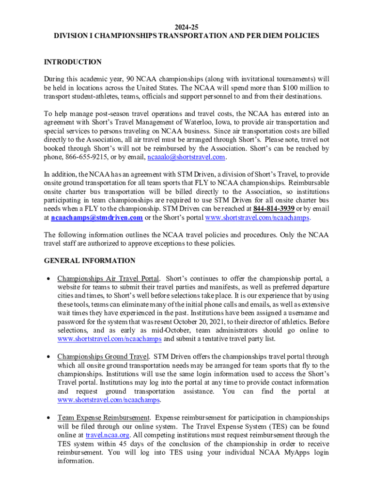 202425 DIVISION I CHAMPIONSHIPS TRANSPORTATION AND PER DIEM POLICIES INTRODUCTION During this academic year, 90 NCAA championships (along with invitational tournaments) will be held in locations across