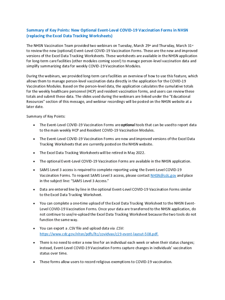 Summary of Key Points: New Optional EventLevel COVID19 Vaccination Forms in NHSN (replacing the Excel Data Tracking Worksheets) The NHSN Vaccination Team provided two webinars on Tuesday, March 29th