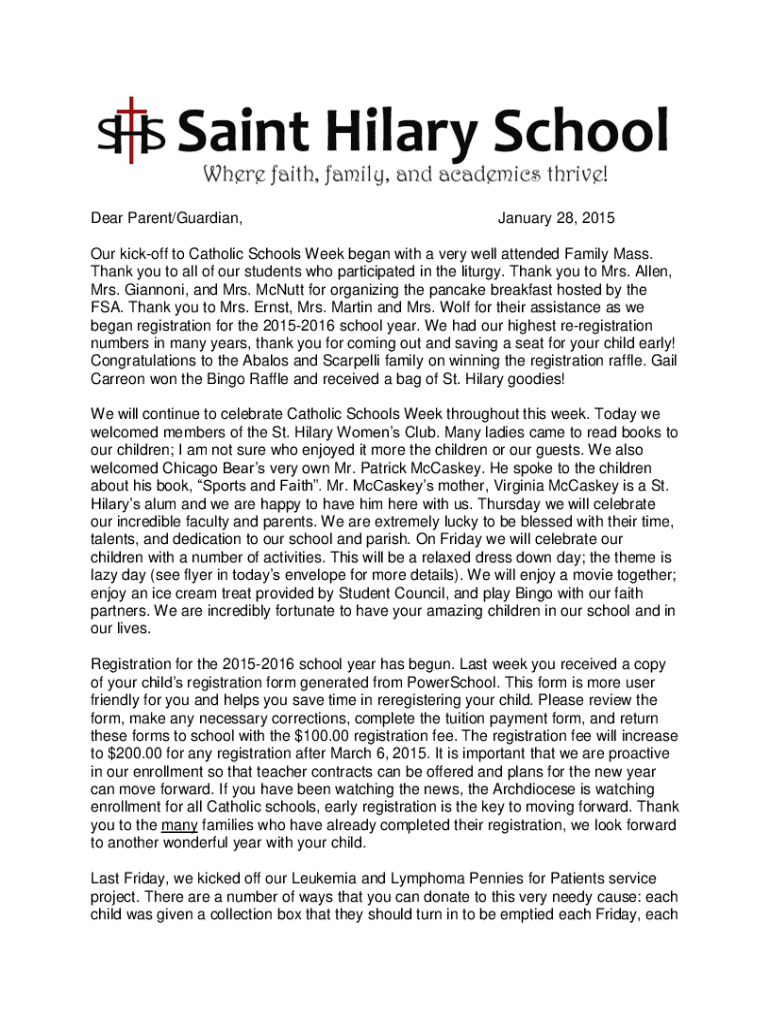 This document is a newsletter for the parents and guardians of St. Hilary School, detailing events, updates, and important announcements related to the school and its community. The newsletter highlights Catholic Schools Week activities, registration information for the upcoming school year, and various fundraising events including community service projects.