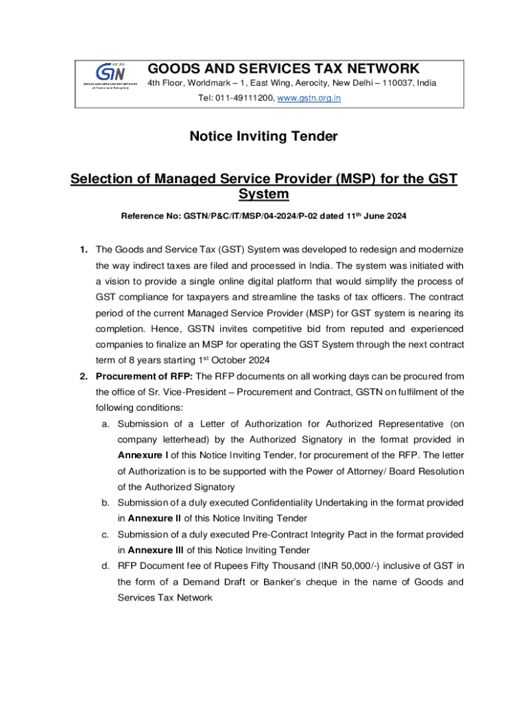 This document is a notice inviting tenders for the selection of a Managed Service Provider (MSP) for the Goods and Services Tax System in India. It outlines the requirements, procedures for procurement of the RFP, and conditions for participation in the bidding process, along with important dates and necessary undertakings.