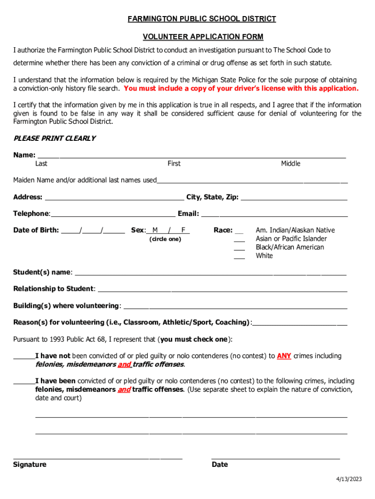 FARMINGTON PUBLIC SCHOOL DISTRICT VOLUNTEER APPLICATION FORM I authorize the Farmington Public School District to conduct an investigation pursuant to The School Code to determine whether there has