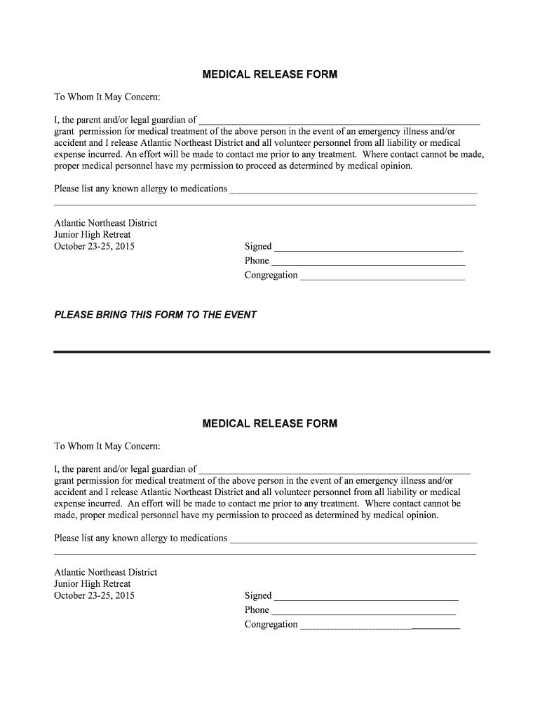 MEDICAL RELEASE FORM To Whom It May Concern: I, the parent and/or legal guardian of grant permission for medical treatment of the above person in the event of an emergency illness and/or accident