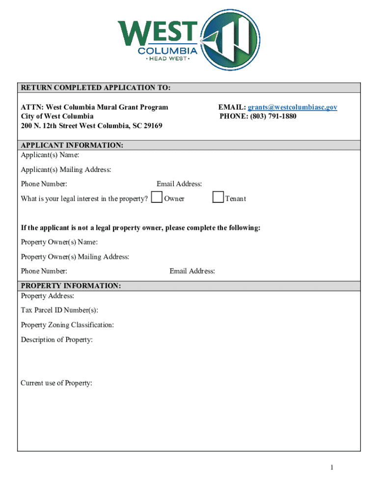 RETURN COMPLETED APPLICATION TO: ATTN: West Columbia Mural Grant Program City of West Columbia 200 N. 12th Street West Columbia, SC 29169EMAIL: grants@westcolumbiasc.gov PHONE: (803) 7911880APPLICANT