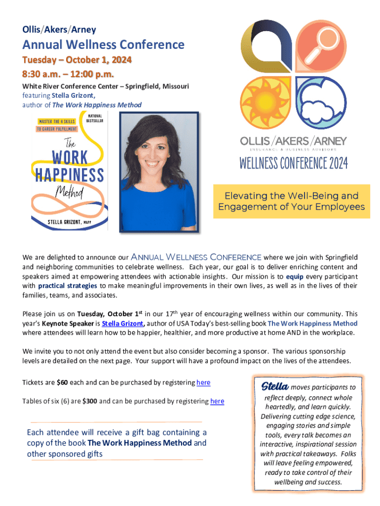 Join us for the Annual Wellness Conference on October 1, 2024, at the White River Conference Center in Springfield, Missouri. This year\'s keynote speaker is Stella Grizont, author of The Work Happiness Method, who will provide attendees with actionable insights to enhance well-being and engagement in both their personal and professional lives.