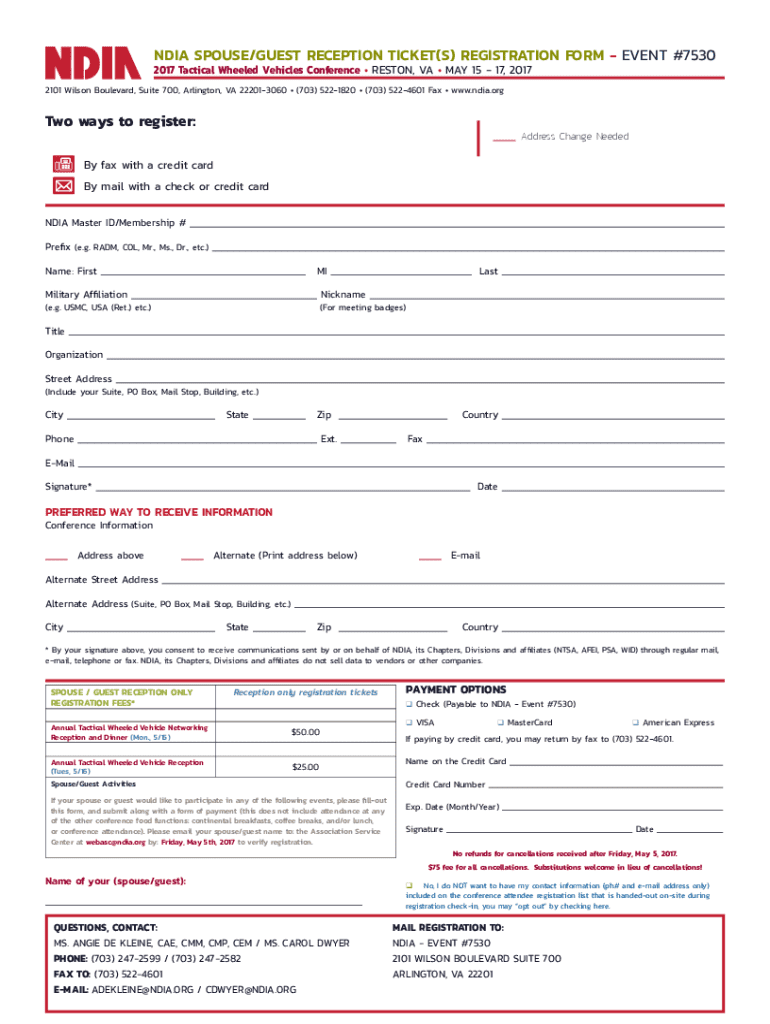 This document is a registration form for the NDIA Spouse/Guest Reception during the Tactical Wheeled Vehicles Conference held in Reston, VA from May 15-17, 2017. It includes sections for personal details, registration fees, and payment options.