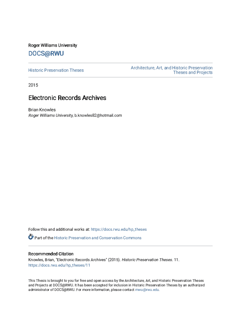 Roger Williams UniversityDOCS@RWU Historic Preservation ThesesArchitecture, Art, and Historic Preservation Theses and Projects2015Electronic Records Archives Brian Knowles Roger Williams University,