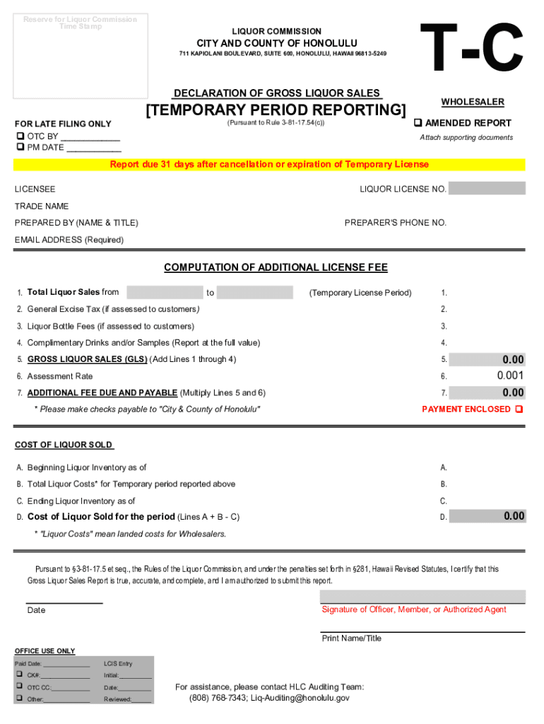 PRINT FORM Reserve for Liquor Commission Time StampRESETLIQUOR COMMISSIONCITY AND COUNTY OF HONOLULU711 KAPIOLANI BOULEVARD, SUITE 600, HONOLULU, HAWAII 968135249DECLARATION OF GROSS LIQUOR SALESFOR