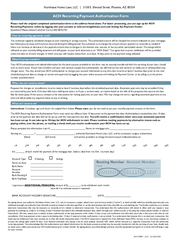 Northeast Home Loan, LLC | 3138 E. Elwood Street, Phoenix, AZ 85034ACH Recurring Payment Authorization Form Please mail the original completed authorization form to the address listed above. For faster