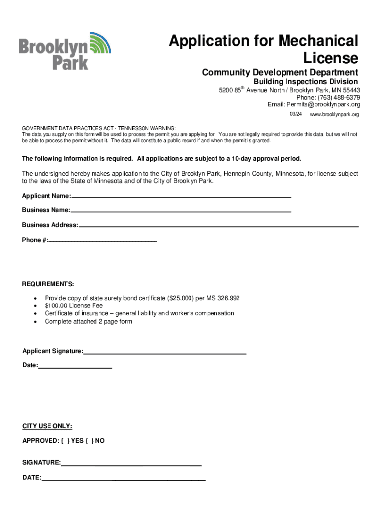 This document is an application for obtaining a mechanical license from the City of Brooklyn Park, Minnesota. It includes requirements for submission, necessary documentation, and notices regarding data practices and compliance with state laws. Applicants are required to provide personal, business, and tax identification information, as well as proof of insurance and compliance with workers\' compensation laws.