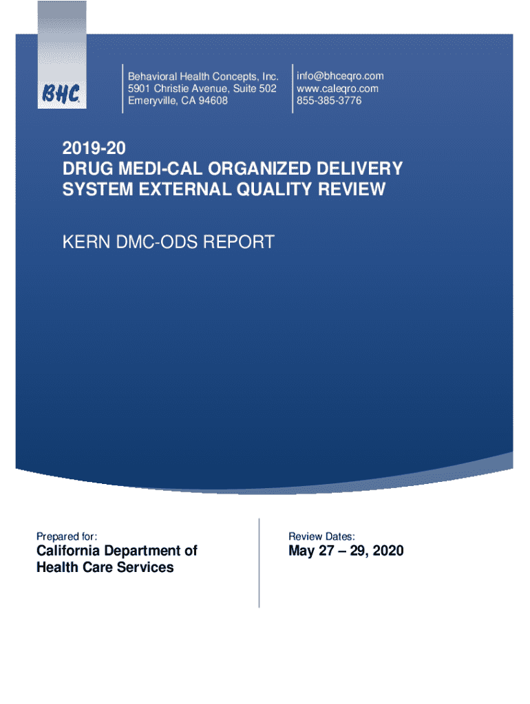 This report provides an evaluation of Kern County\'s Drug Medi-Cal Organized Delivery System (DMC-ODS) for the fiscal year 2019-20, focusing on access, quality, and outcomes of substance use disorder treatment services. It includes performance measures, client feedback, recommendations for improvement, and an overview of the service delivery system.