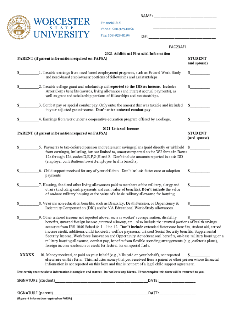 NAME: ___ Financial AidPhone: 5089298056 Fax: 5089298194___ ID#: ___ FAC23AFI2021 Additional Financial Information PARENT (if parent information required on FAFSA)STUDENT and spouse)$___1. Taxable