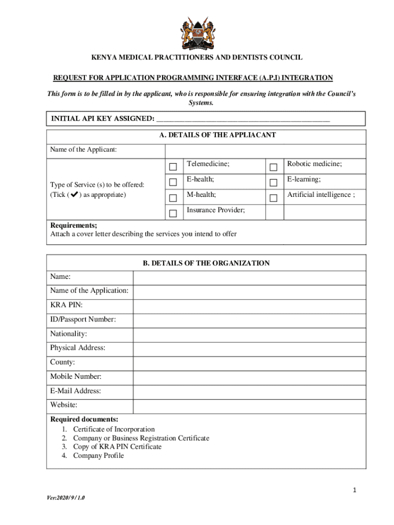 KENYA MEDICAL PRACTITIONERS AND DENTISTS COUNCIL REQUEST FOR APPLICATION PROGRAMMING INTERFACE (A.P.I) INTEGRATION This form is to be filled in by the applicant, who is responsible for ensuring integration