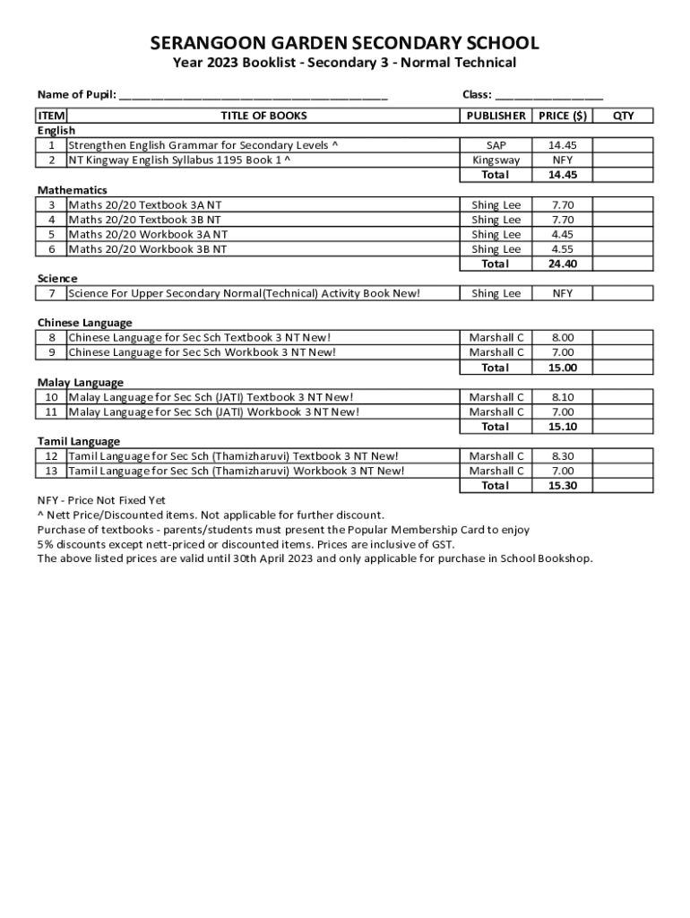 This document contains the booklist for Secondary 3 Normal Technical students at Serangoon Garden Secondary School for the year 2023, including required textbooks and stationery with pricing information. It also provides instructions for ordering the items through an online portal or school bookshop.