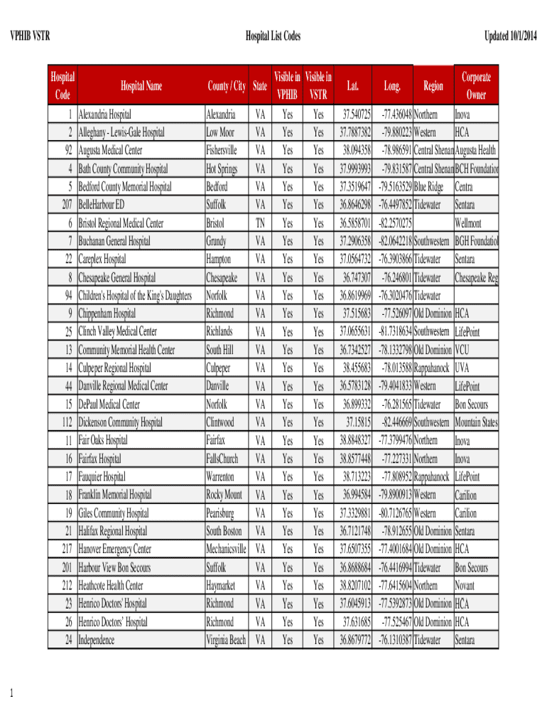 VPHIB VSTRHospital List Codes Hospital Code 1 2 92 4 5 207 6 7 22 8 94 9 25 13 14 44 15 112 11 16 17 18 19 21 217 201 212 23 26 241Hospital Name Alexandria Hospital Alleghany LewisGale Hospital Augusta