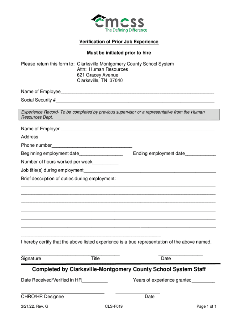 Verification of Prior Job Experience Must be initiated prior to hire Please return this form to: Clarksville Montgomery County School System Attn: Human Resources 621 Gracey Avenue Clarksville, TN