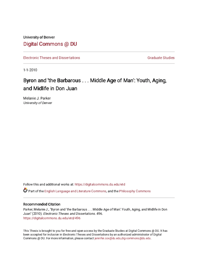 University of DenverDigital Commons @ DU Electronic Theses and DissertationsGraduate Studies112010Byron and \'the Barbarous . . . Middle Age of Man\': Youth, Aging, and Midlife in Don Juan Melanie