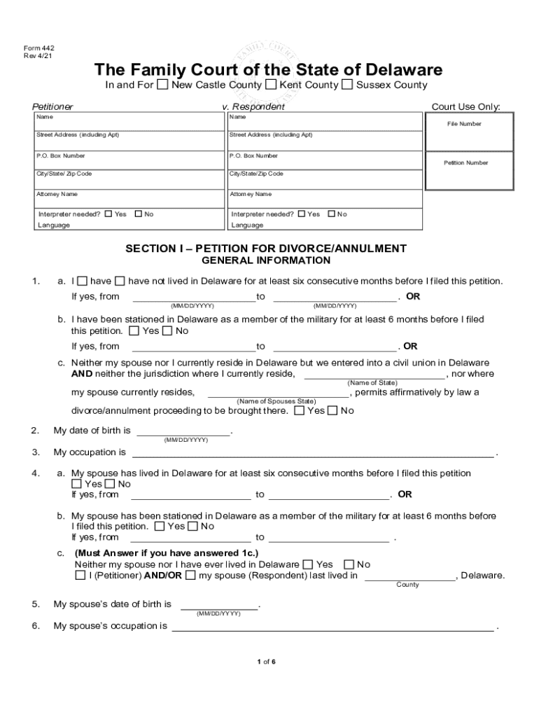 Form 442 Rev 4/21The Family Court of the State of Delaware In and ForNew Castle CountyPetitionerKent CountySussex Countyv. RespondentNameCourt Use Only:Name File NumberStreet Address (including Apt)Street