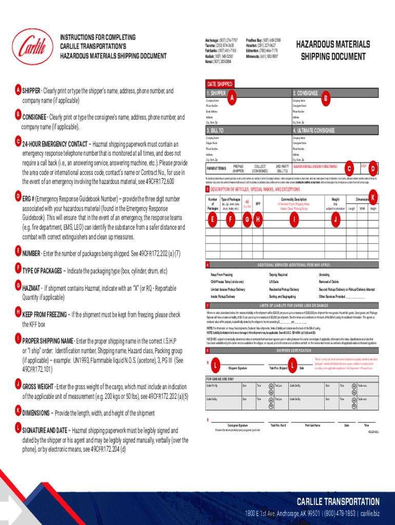 INSTRUCTIONS FOR COMPLETING CARLILE TRANSPORTATIONS HAZARDOUS MATERIALS SHIPPING DOCUMENTAnchorage: (907) 2767797 Tacoma: (253) 8742633 Fairbanks: (907) 4517155 Kodiak: (907) 3433290 Kenai: (907)