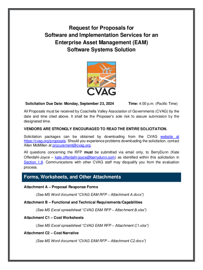 Request for Proposals for Software and Implementation Services for an Enterprise Asset Management (EAM) Software Systems SolutionSolicitation Due Date: Monday, September 23, 2024Time: 4:00 p.m. (Pacific