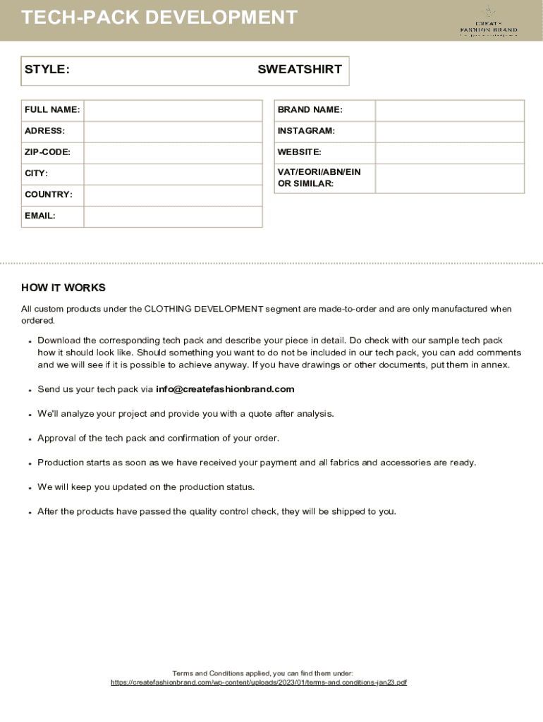 TECHPACK DEVELOPMENT STYLE:SWEATSHIRTFULL NAME:BRAND NAME:ADRESS:INSTAGRAM:ZIPCODE:WEBSITE:CITY:VAT/EORI/ABN/EIN OR SIMILAR:COUNTRY: EMAIL:HOW IT WORKS All custom products under the CLOTHING DEVELOPMENT