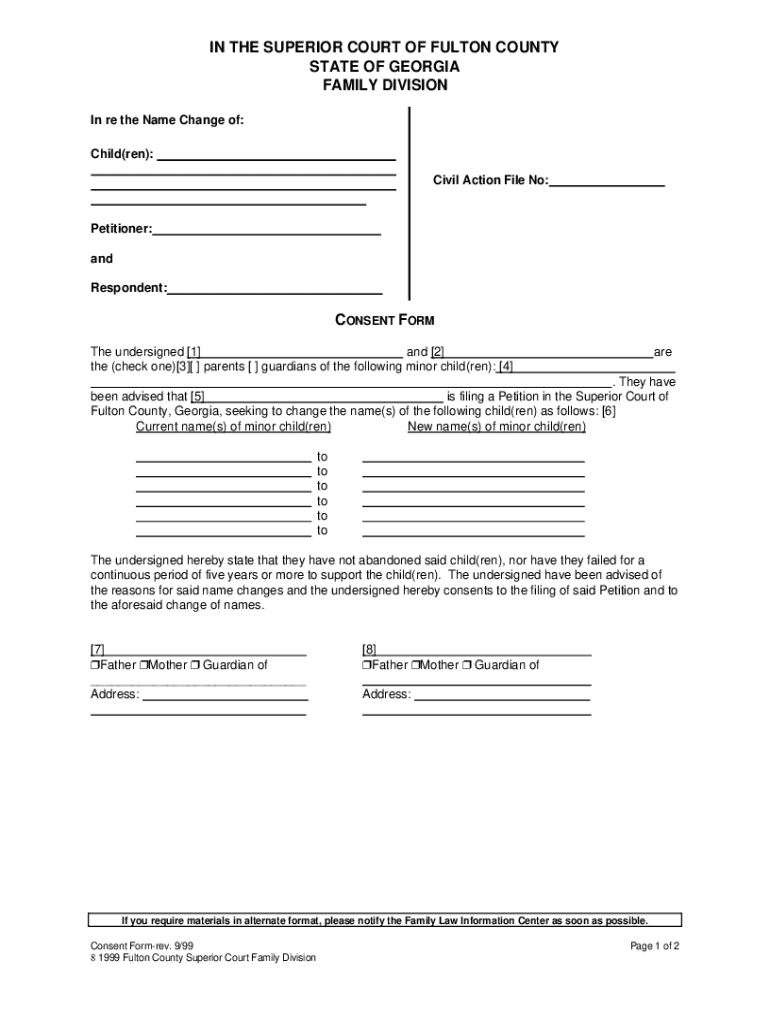 IN THE SUPERIOR COURT OF FULTON COUNTY STATE OF GEORGIA FAMILY DIVISION In re the Name Change of: Child(ren): Civil Action File No:Petitioner: and Respondent:CONSENT FORM The undersigned [1] and [2]