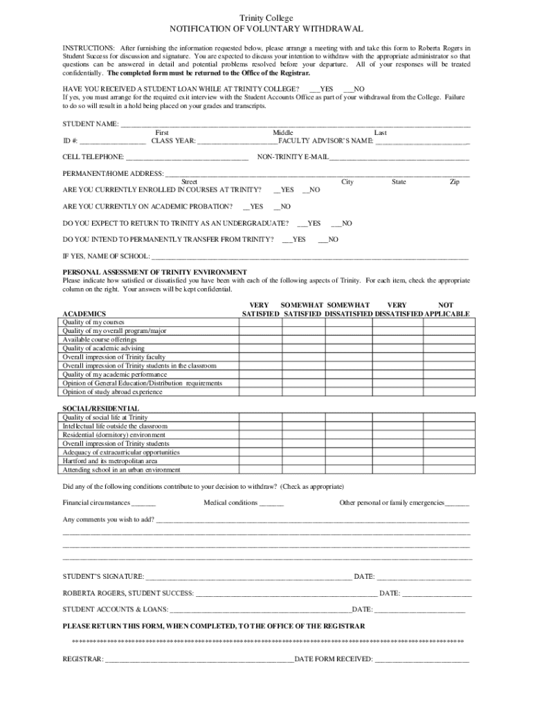 This form is intended for students at Trinity College who wish to voluntarily withdraw from their studies. It includes sections for personal information, academic assessments, and reasons for withdrawal, as well as instructions for discussion with the appropriate administrator before submitting the form to the Office of the Registrar.