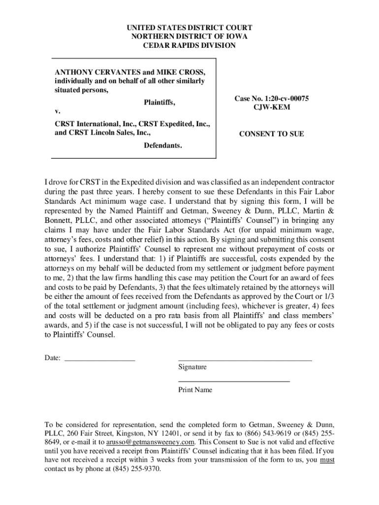 UNITED STATES DISTRICT COURT NORTHERN DISTRICT OF IOWA CEDAR RAPIDS DIVISIONANTHONY CERVANTES and MIKE CROSS, individually and on behalf of all other similarly situated persons, Case No. 1:20cv00075