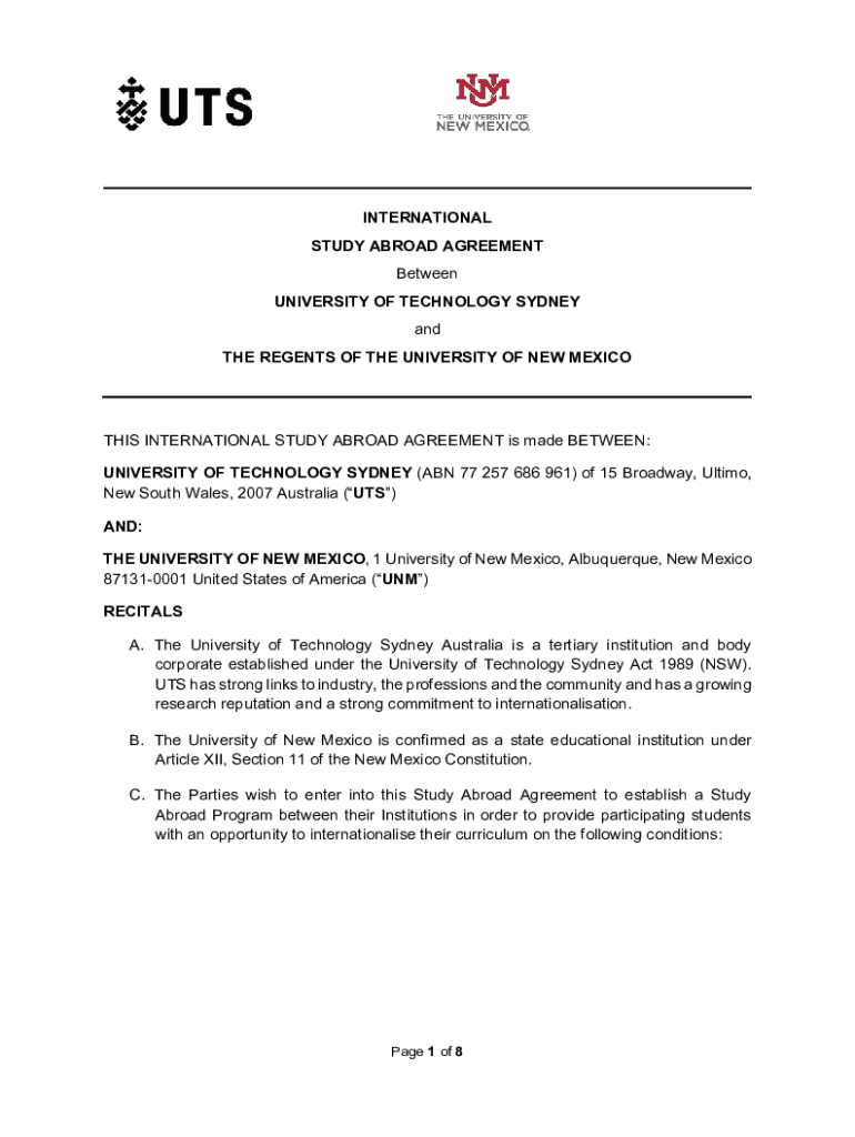 INTERNATIONAL STUDY ABROAD AGREEMENT Between UNIVERSITY OF TECHNOLOGY SYDNEY and THE REGENTS OF THE UNIVERSITY OF NEW MEXICOTHIS INTERNATIONAL STUDY ABROAD AGREEMENT is made BETWEEN: UNIVERSITY OF