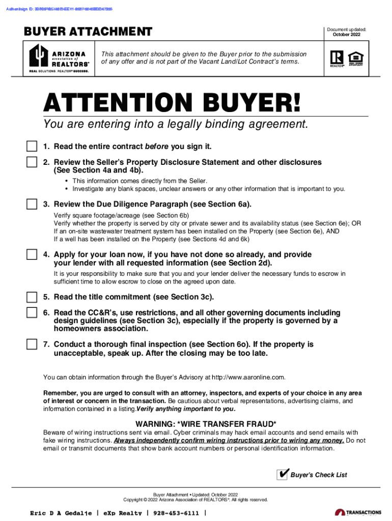 This document outlines a legally binding agreement for the purchase of vacant land or lot in Arizona. It includes essential information regarding buyer and seller obligations, financing options, due diligence requirements, and closing procedures. The contract also emphasizes the importance of consulting professionals and outlines potential risks, including wire transfer fraud and property inspections.