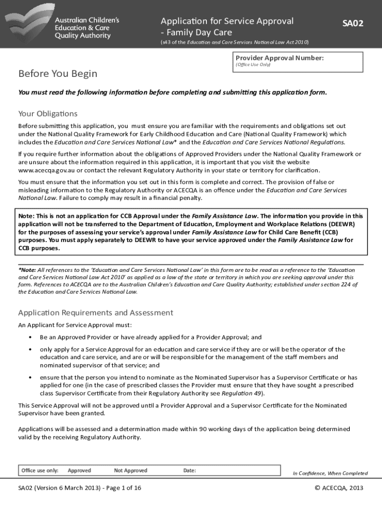 Applicaion for Service Approval Family Day CareSA02(s43 of the Educaion and Care Services Naional Law Act 2010)Provider Approval Number: (Oice Use Only)Before You Begin You must read the following
