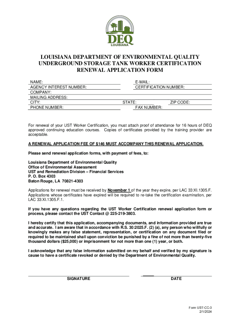 This form is used by individuals seeking to renew their Underground Storage Tank (UST) Worker Certification in Louisiana. Applicants must provide personal information, proof of continuing education, and a renewal fee. Completed applications must be submitted by the specified deadline to avoid re-examination.