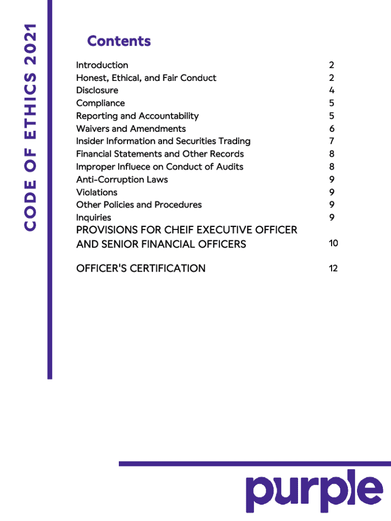 This Code of Ethics outlines the standards of honest, ethical, and fair conduct expected from all officers, directors, employees, and contractors of Purple Innovation, Inc. It covers the handling of conflicts of interest, compliance with laws, accurate financial reporting, and mechanisms for reporting violations. The Code emphasizes integrity, transparency, and accountability in all business dealings.