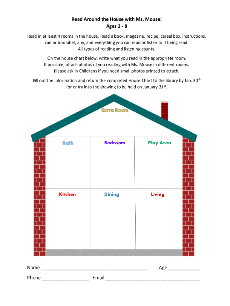 A fun scavenger hunt activity for children aged 2 to 8 that encourages reading in various rooms of the house. Participants can read different materials and complete a house chart to share their experiences, and they have the opportunity to win a prize by returning the chart to the library.