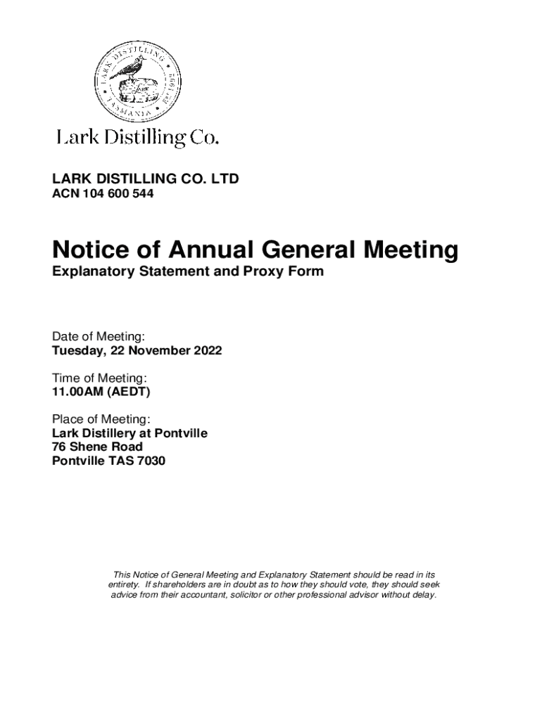This document serves as the official notice for the Annual General Meeting (AGM) of Lark Distilling Co. Ltd to be held on November 22, 2022. It includes details about the meeting\'s time, place, and agenda, including the adoption of the Remuneration Report, election and re-election of directors, and proposals for the approval of the company\'s Equity Incentive Plan and a 10% Placement Facility.